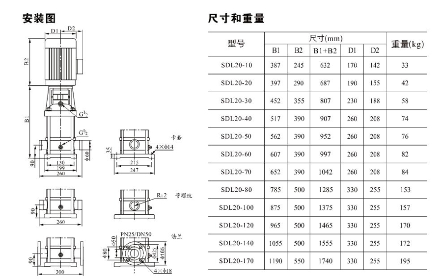 SDL20/SDLT20為配用標(biāo)準(zhǔn)電機(jī)的非自吸立式多級(jí)離心泵,電機(jī)軸和泵軸用聯(lián)軸器直接聯(lián)接,把拉桿用螺母將外筒,過流部件固定在支架和進(jìn)出水體之間,泵進(jìn)出水口在泵底部的同一直線上。泵可根據(jù)需要配置智能保護(hù)器,對(duì)泵的干轉(zhuǎn)、缺相、過載等進(jìn)行有效的保護(hù)。