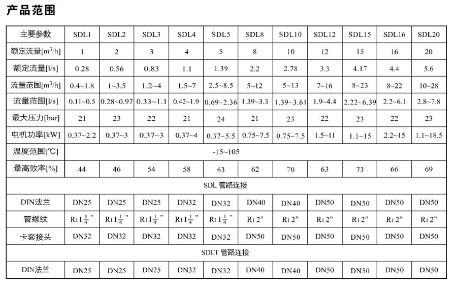 SDL20/SDLT20是一種多功能產(chǎn)品,可以輸送從自來水到工業(yè)液體的各種不同介質(zhì),適用于不同溫度、流量和壓力范圍。