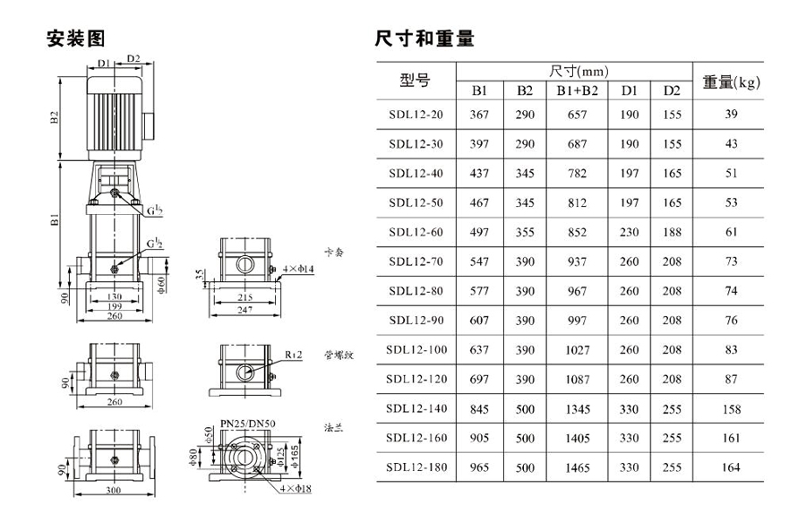 SDL12/SDLT12為配用標準電機的非自吸立式多級離心泵,電機軸和泵軸用聯(lián)軸器直接聯(lián)接,把拉桿用螺母將外筒,過流部件固定在支架和進出水體之間,泵進出水口在泵底部的同一直線上。泵可根據(jù)需要配置智能保護器,對泵的干轉、缺相、過載等進行有效的保護。