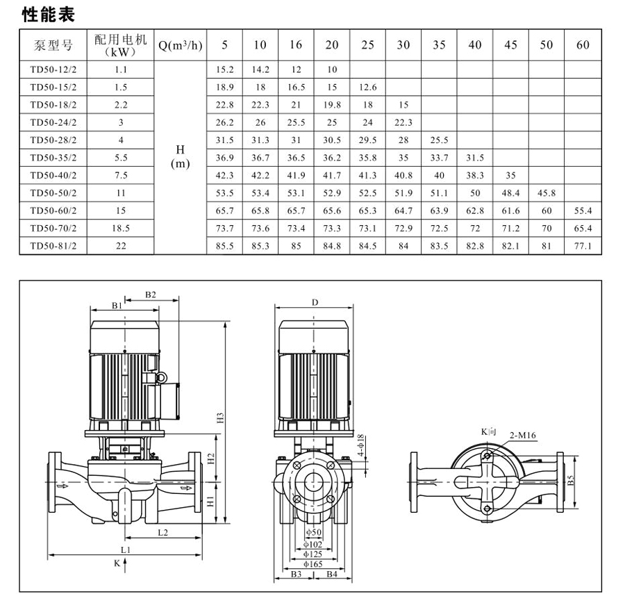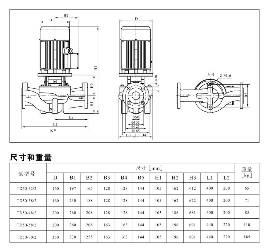 TD50系列單級管道離心泵,配有標準電 機和機械密封。此類產品的結構與相近類型產品相比,更不易受到泵送液體中雜質的影響。產品設計為頂部可拉出的拆裝形式,其可 以在不影響管路系統的情況下對泵進行維修。所有泵采用創新式便拆式機械密封,更好機械密封無需拆卸電機。